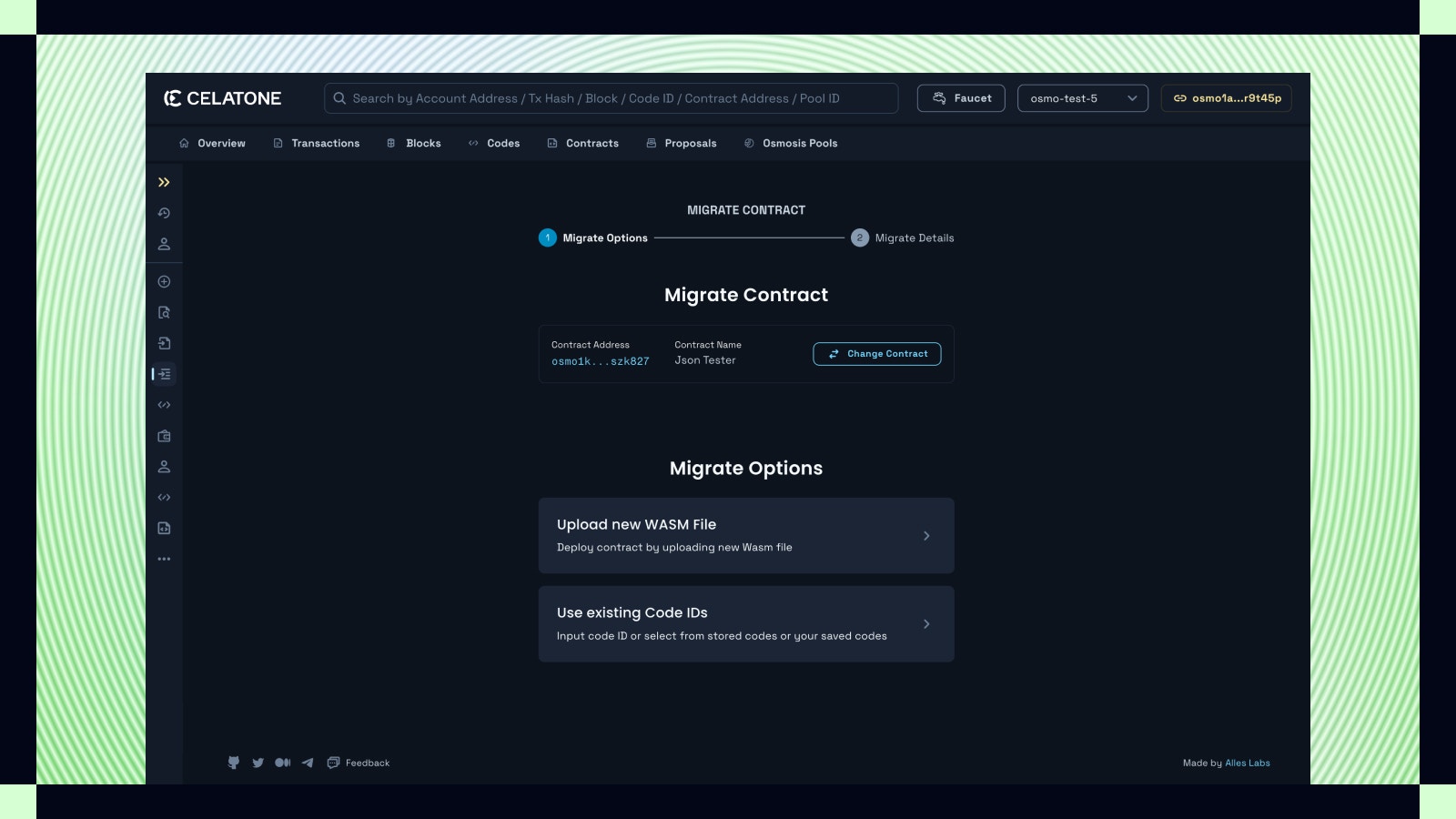 - Contract List: In lists like “Instantiated by me” or “Saved Contracts”, contracts you can administer will have an active “Migrate” option.