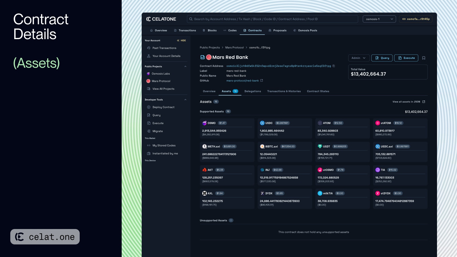 - Unsupported Assets: Shows any tokens or assets that are held by the contract but are not officially supported or recognized. These may include less common tokens or those specific to certain functions within the contract such as Factory Token, LP Token, IBC Token, Gamm Token, etc..