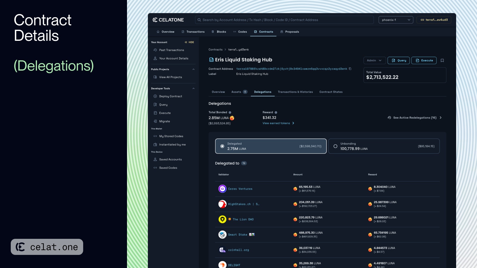 - Delegated: Lists the individual validators to whom tokens are staked, the amount staked, and any rewards from each validator.