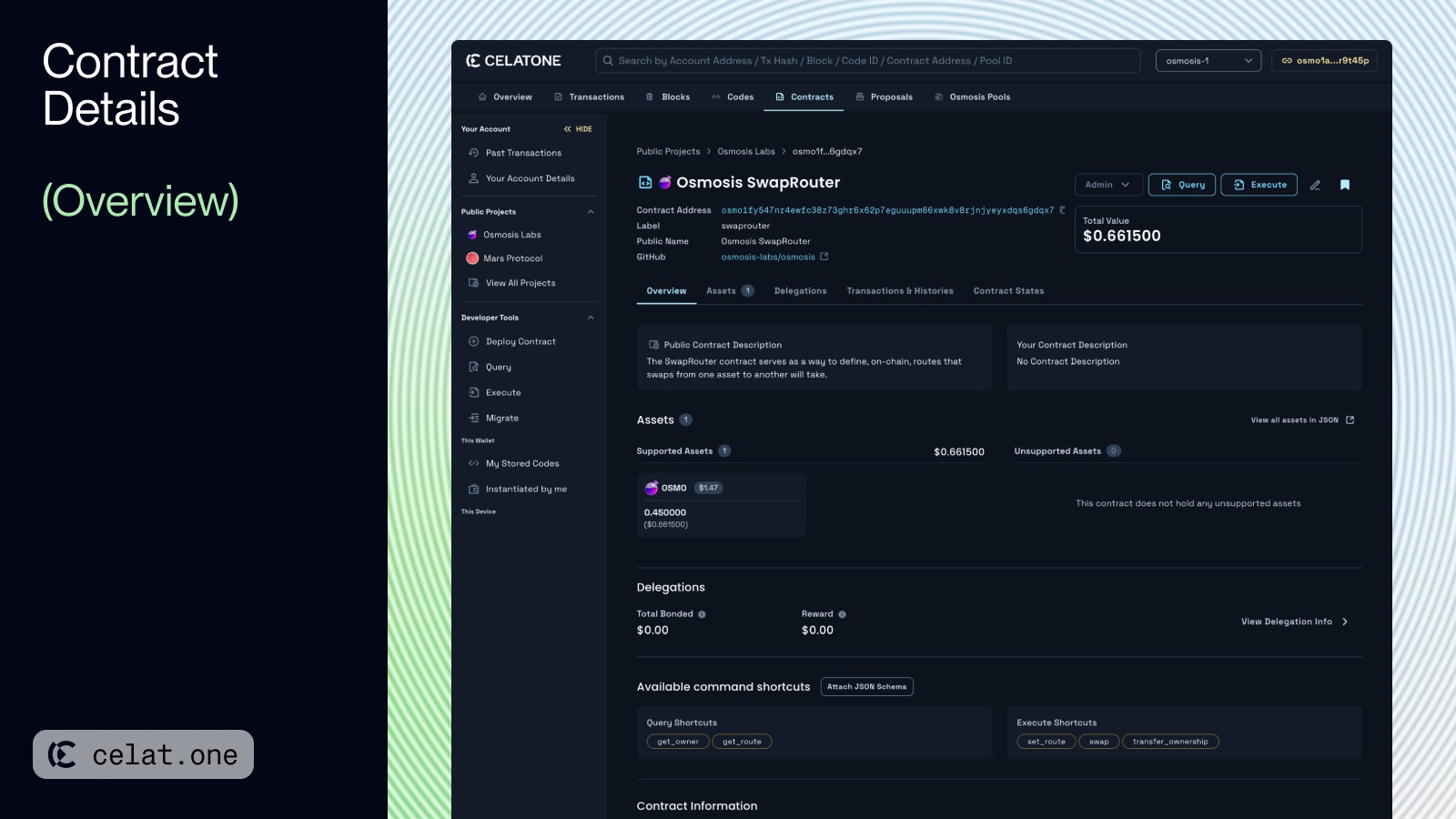 - Command Shortcuts: Quick access to execute common queries or transactions related to the contract. Select any shortcut will send you to Query/Execute page.