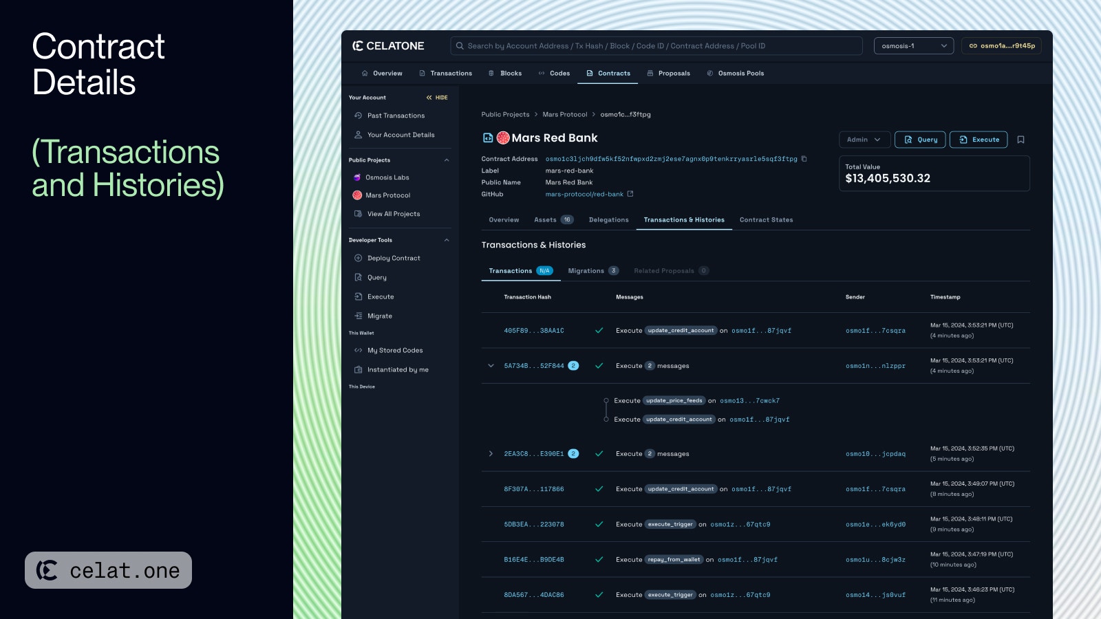 - Contract Information: Detailed info such as the originating code, CW2 compliance info, admin address, and block height at instantiation.