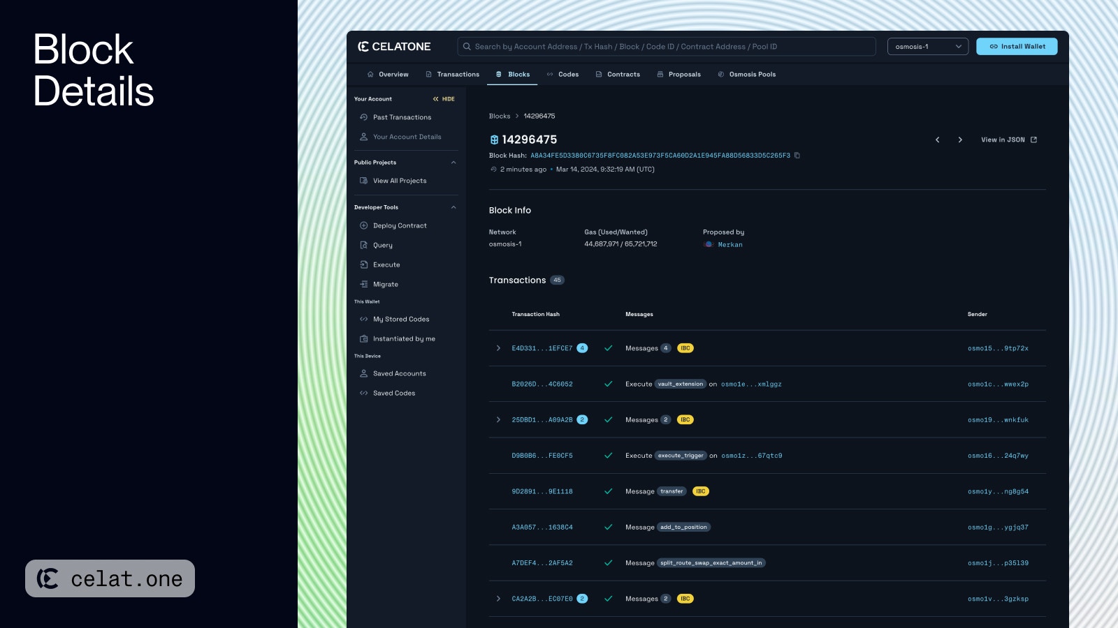 - Block Info: Includes the network name, the gas used versus the gas limit for the block, and the proposer of the block.