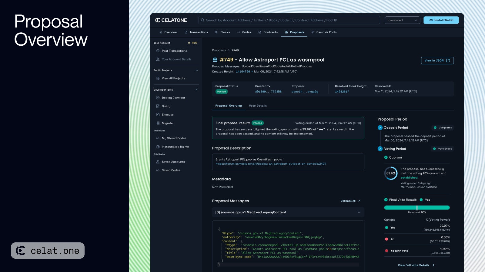 - Proposal Status: Shows the current phase of the proposal, including start/end dates and deposit or voting status. There are typically three phases: Deposit Period, Voting Period, and post-vote status, which reflects the outcome of the vote.
