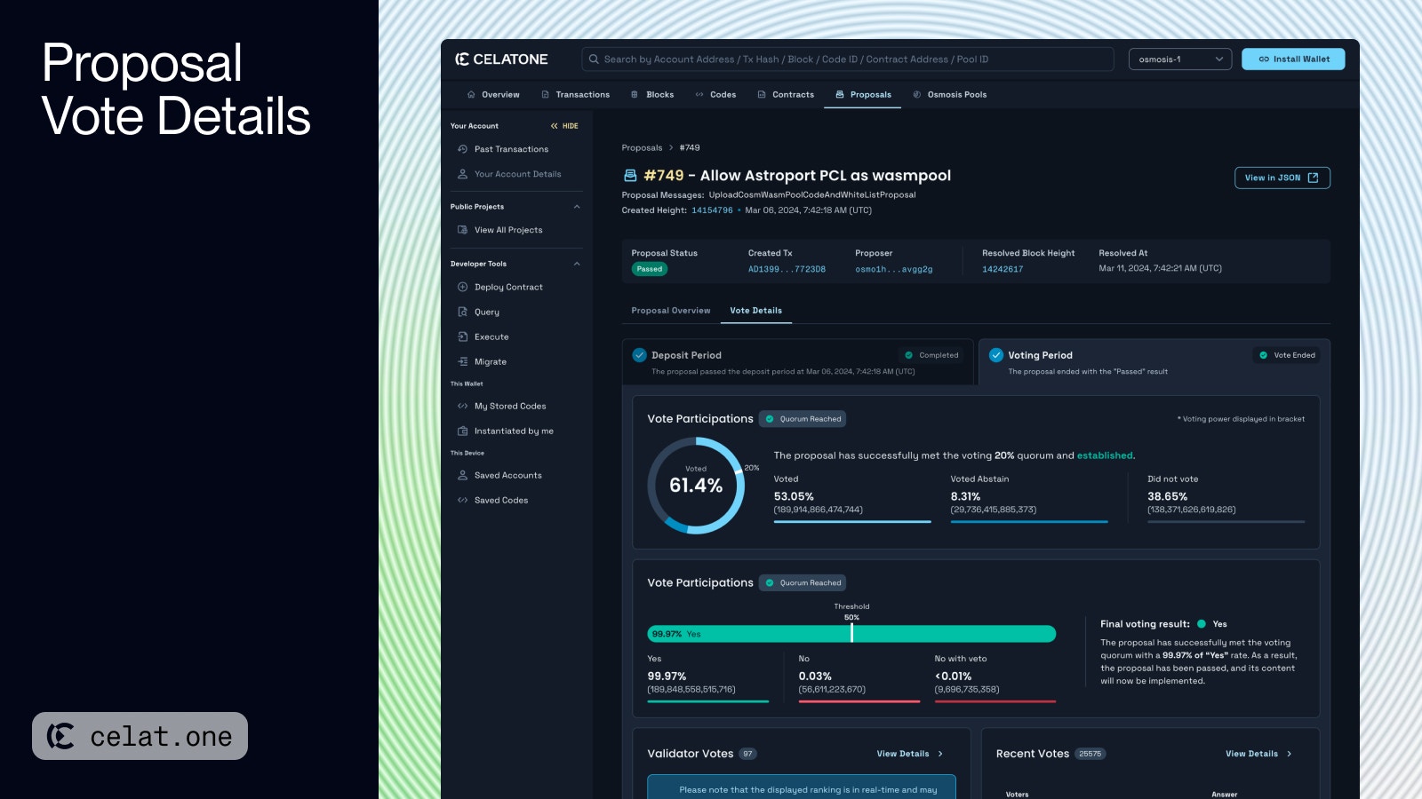 - Validator Votes: Lists individual votes from validators, showcasing the governance participation from these key network stakeholders. You can view full list of each validator votes by clicking “View Details”.