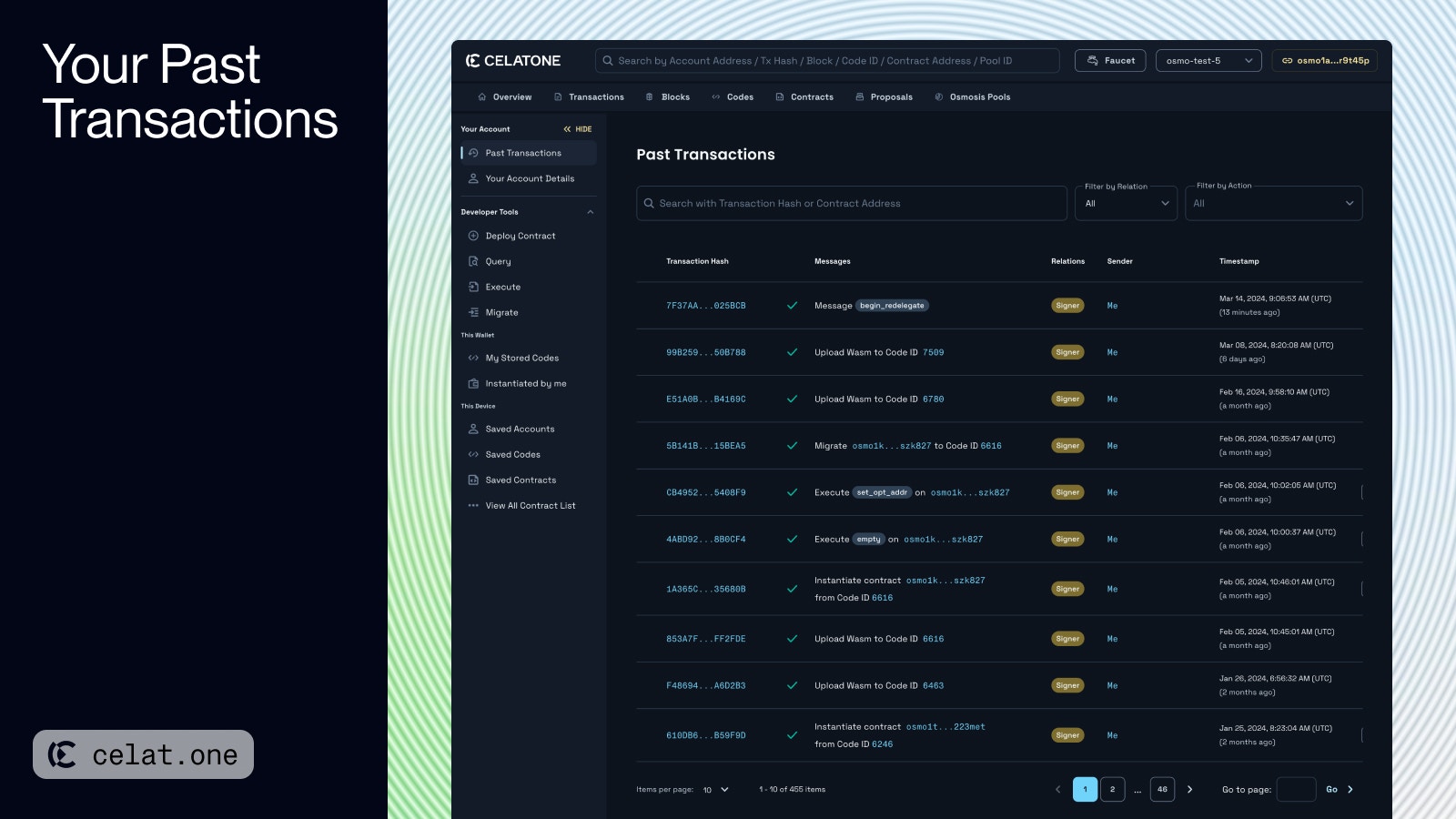 The “Past Transactions” section on Celatone displays a record of your wallet’s transactions, including those you’ve signed and related transactions. For each transaction, you’ll see:- Transaction Hash: The unique identifier for the transaction.
