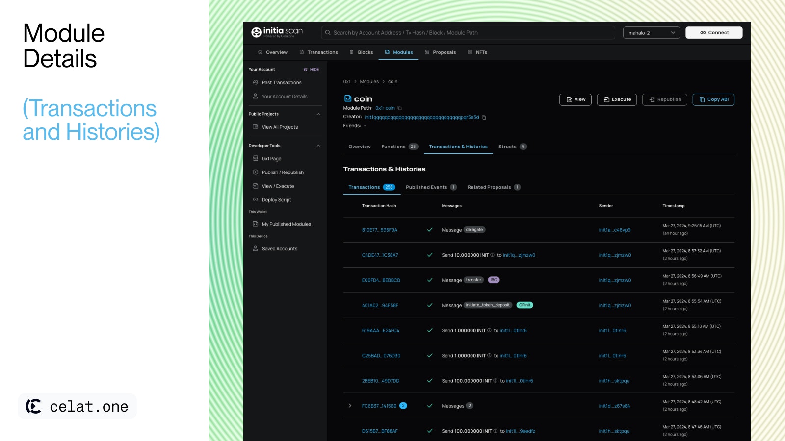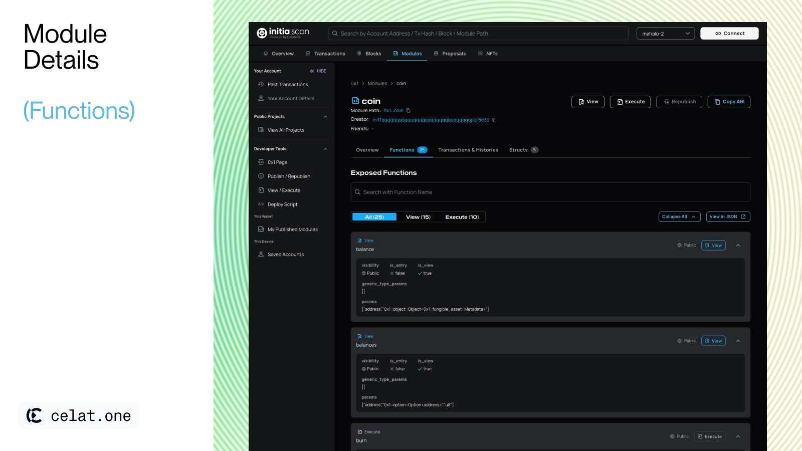 - Call-to-action options: Enabling users to view, execute, or copy the module’s ABI with ease. Users can also republish the module if it was originally published by them.