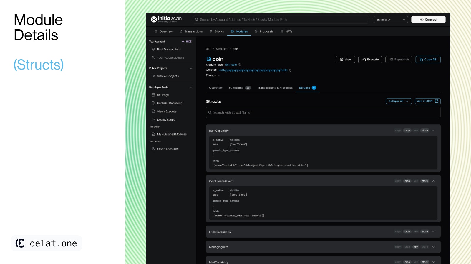 - Struct Details: Each struct listed under this section can be expanded to reveal specific info such as abilities, fields and generic type parameter. Learn more about structs in Initia Docs.