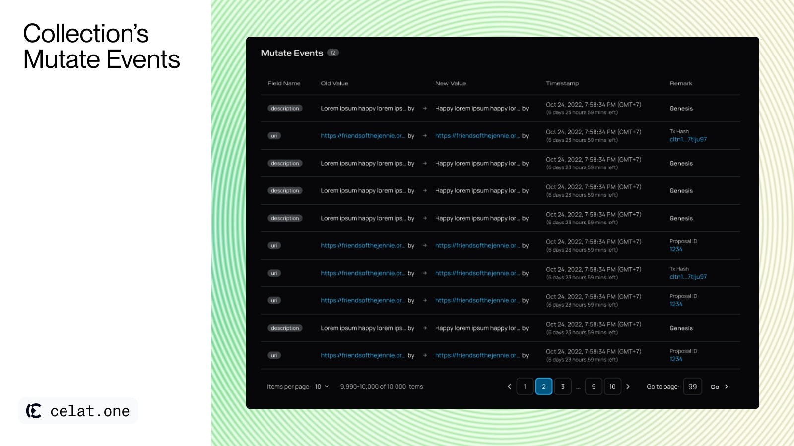 This section provides a comprehensive log of all mutation events associated with the selected NFT Collection. These events may include any changes or updates to the description or URI of the collection.