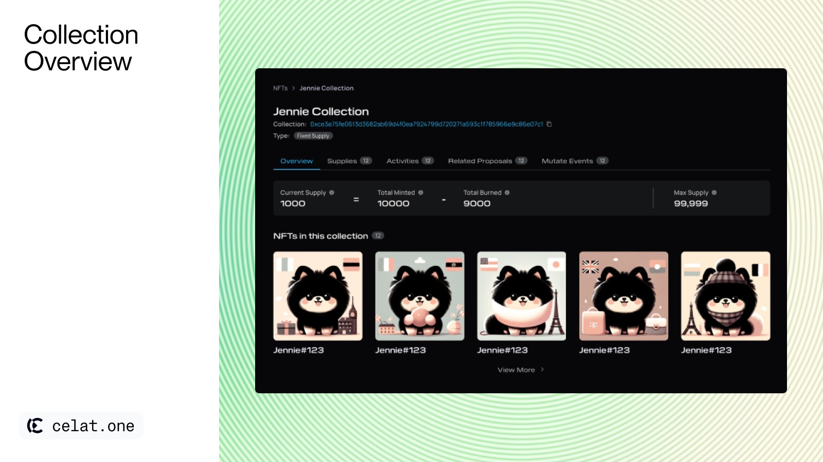 Current Supply,Total Minted,Total BurnedandMax Supplyof the collection - NFTs holdings: Display the collection’s currently holding NFTs, with the badge that represent amount of all NFTs in the collection. More information on ”NFTs in this collection”
