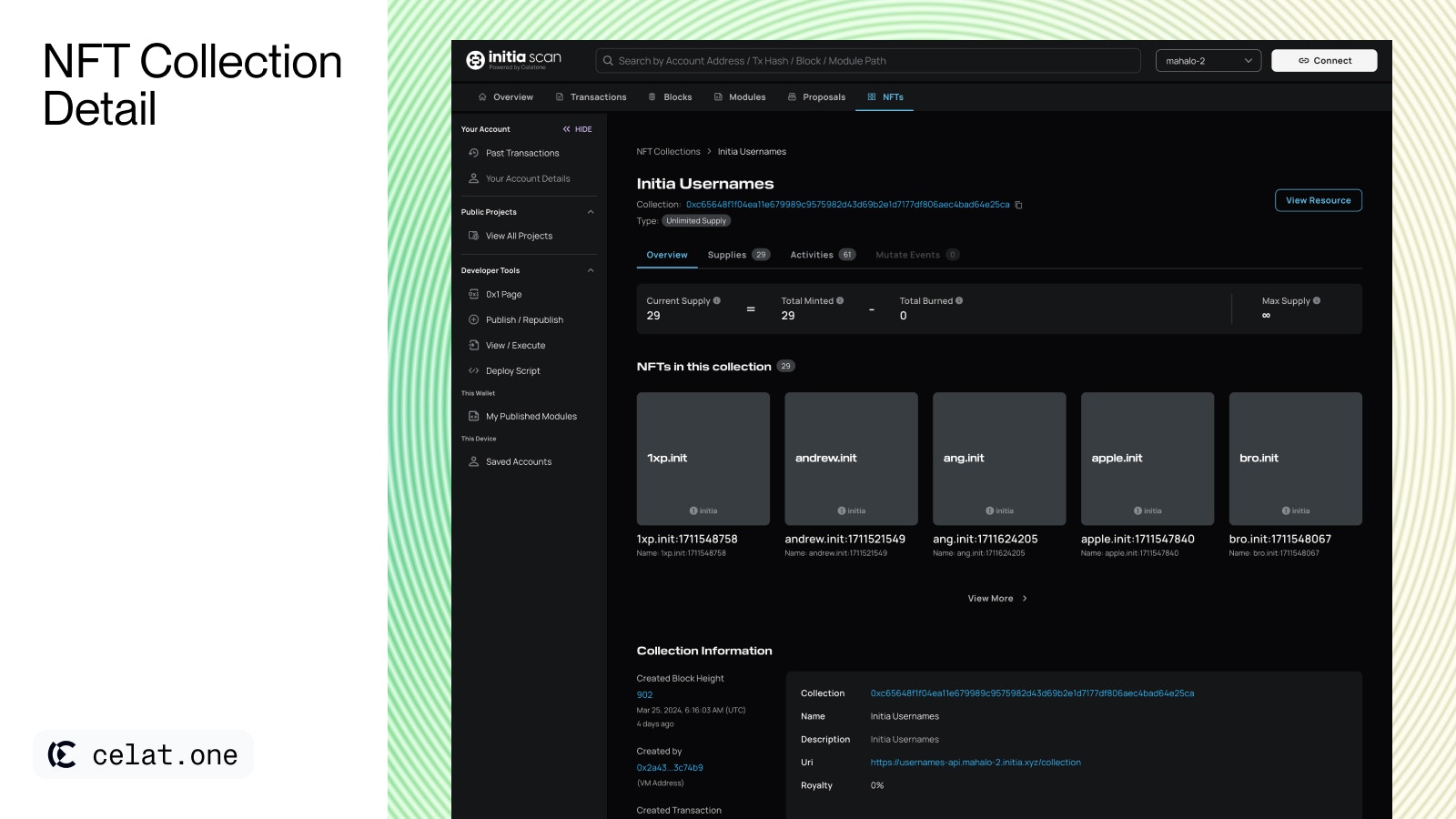 - Created Block Height: Indicates the blockchain height at which the collection was first created.