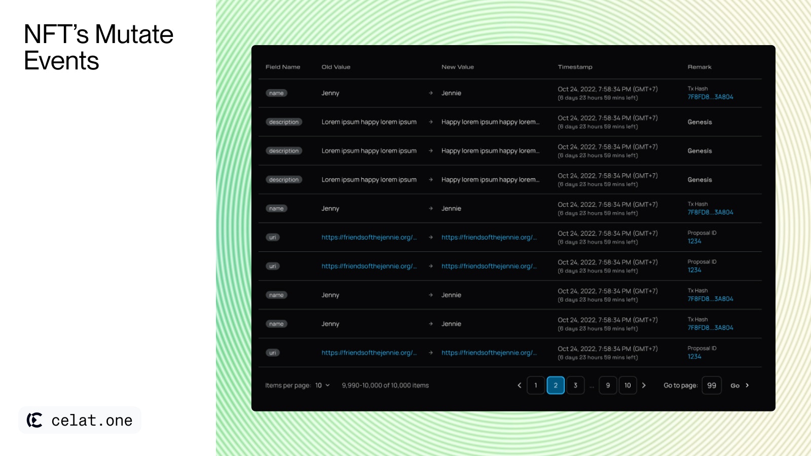 This section provides a comprehensive log of all mutation events associated with the selected NFT. These events may include any changes or updates to the name, description or URI of the NFT.