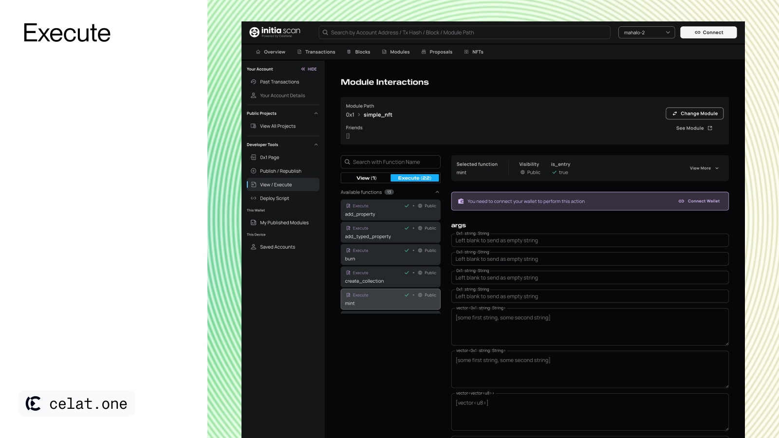 true: Functions with this property can be executed directly through Celatone or by using compatible tools.false: These functions cannot be executed directly; they require specific methods for invocation, such as encapsulating them in a ‘Script’ or calling them through particular procedures. See more about Script